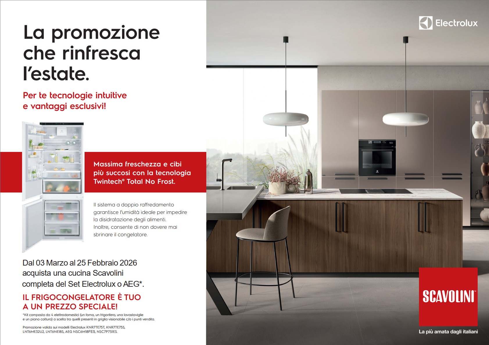 Acquista una cucina Scavolini completa del Set Electrolux o AEG (set composto da 4 elettrodomestici tra: forno, frigorifero, lavastoviglie e piano cottura), il Frigocongelatore è tuo a un prezzo speciale!